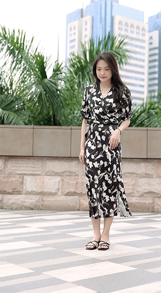 但它虽然具有和丝绸相差无几的视觉结果和穿戴感,却没实丝那么娇贵,用的是粘胶纤维和高弹的氨纶,几乎不需要怎样打理,很省心。裙子的剪裁也很讲究,裙摆用了斜裁工艺,寂静坐着的时候可能没感觉有什么出格,一路来,由于裙摆的布幅比通俗的曲裁裙子更大,裙摆会随风漂泊,呈现诱人的海浪结果,很有律动感。