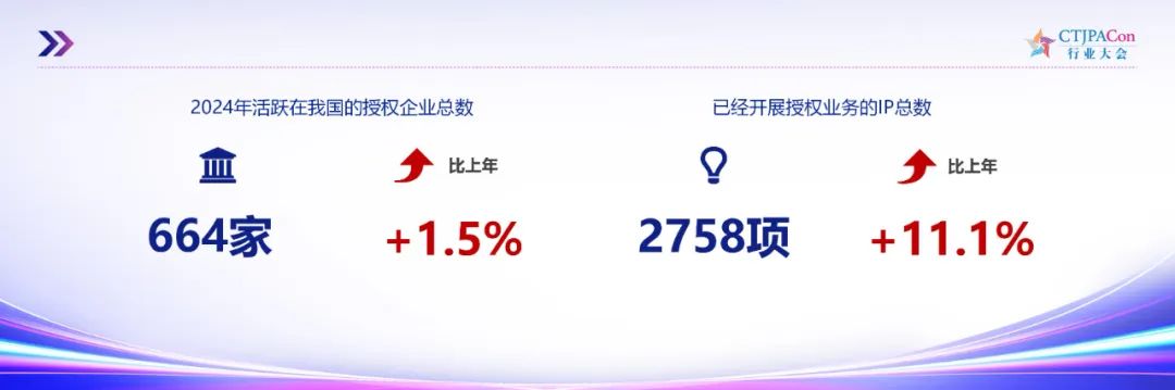 3 月 27 日,由中国玩具和婴童用品协会(简称中国玩协)从办的中国品牌授权年会暨第十五届中国儿童财产成长大会正在姑苏太湖国际会议核心隆沉揭幕。中国玩协会长梁梅正在会上发布由中国玩协授权行业分会编写的《2025 中国授权行业成长》(简称)。2024 年国内市场年度授权商品零售总额和授权金规模持续了七年的增加态势,呈较着增加。2024 年新增 IP 中占比最多的 3 个品类为动漫、文化艺术和影视综艺。被授权行业和授权形式呈多元化成长,潮水玩具受“谷子热”影响增加敏捷。跨越 90% 的受访被授权商认为 IP 授权带动发卖提拔。采办授权产物的受访消费者一半为 IP 快乐喜爱者,他们对统一 IP 忠实度较高,并情愿将更多的可安排收入用于采办授权产物。2024 年活跃正在我国的授权企业总数为 664 家,曾经开展授权营业的 IP 总数为 2758 项,同比增加 11。1%。