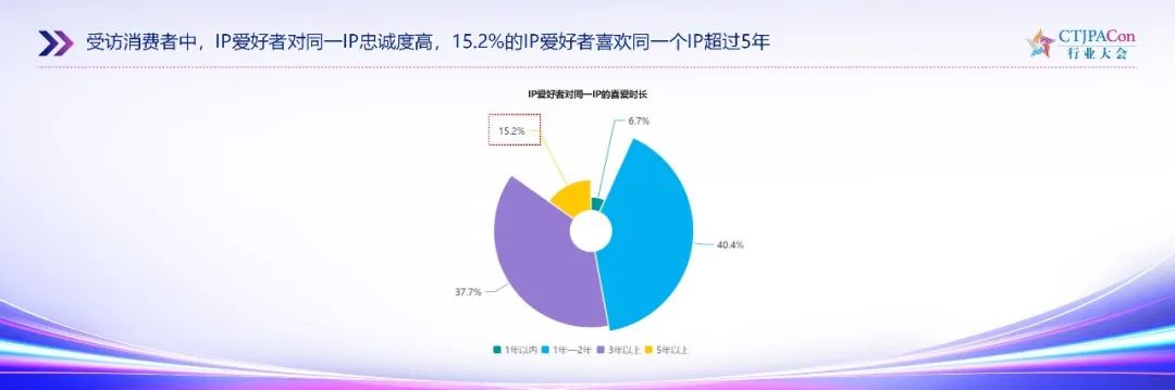 受访消费者中,IP 快乐喜爱者对统一 IP 忠实度高,15。2% 的 IP 快乐喜爱者喜好统一个 IP 跨越 5 年。