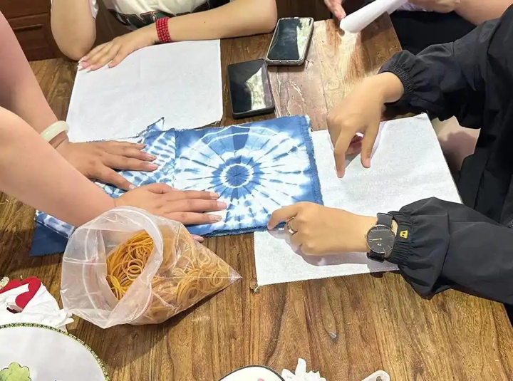 队员们按照影像材料领会了扎染的全过程,通过纱、线、绳等东西,缝、缚、缀、夹等多种形式组合后进行染色,最初将其展开烘干固色晾晒,制出美轮美奂的扎染做品。